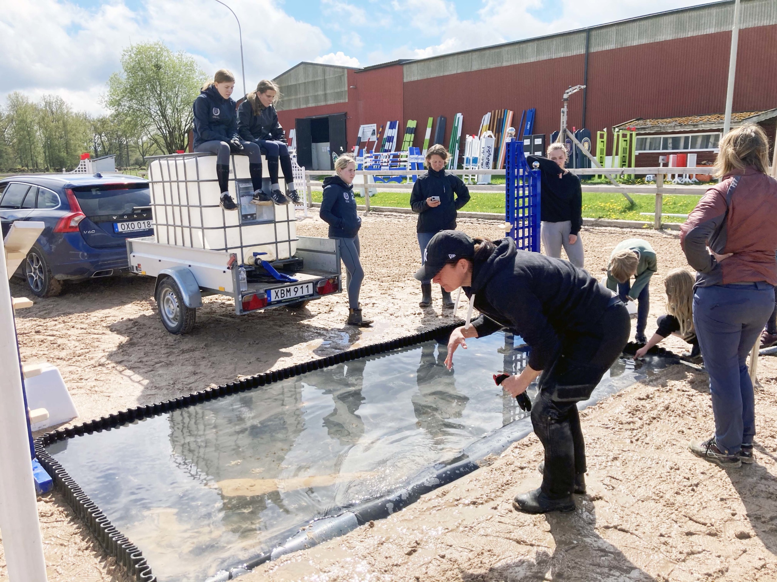 Den kollektiva taktiken var enkel: Fram med spadar, gräva ut, använda ögonmått och på med mattan. Efter det: vattentest. Därefter: okulärbesiktning, där vi fann att mattan lutade en aning åt helt fel håll, vilket fick vattnet att rinna ner i fibersanden. Vår ideella arbetsgrupp nådde sedan den punkt där Snillen Spekulerar möter Fråga Lund. Med gemensamma expertkunskaper landade vi i slutsatsen att ena sidan måste höjas upp och några minuter senare hade vi fått till ett slutresultat som tilltalade alla. Den nya banan, med vattengraven som juvelen i kronan, var klar för omgående invigning, vilket bland andra Angelo och LillyBelle bidrog till.