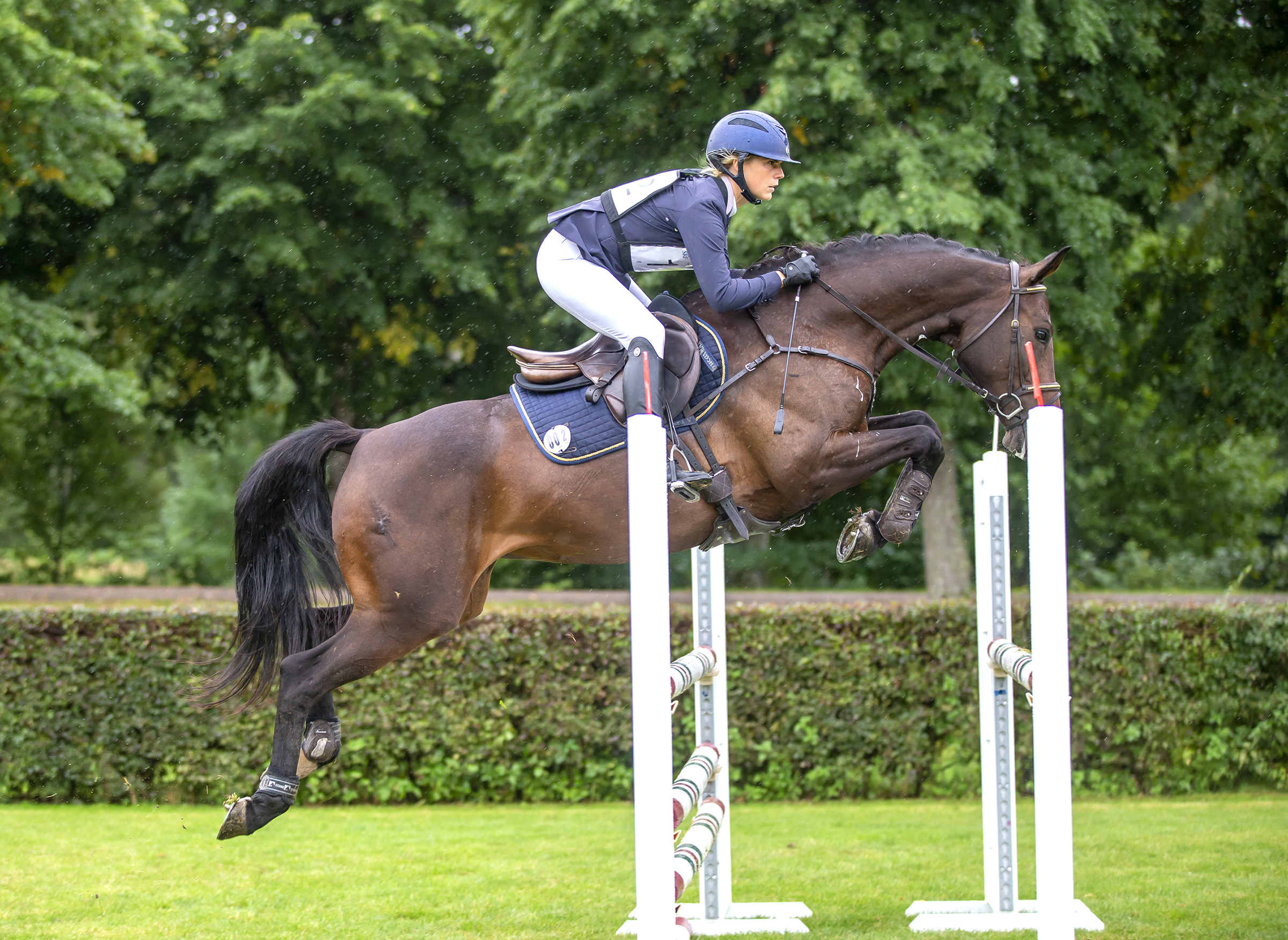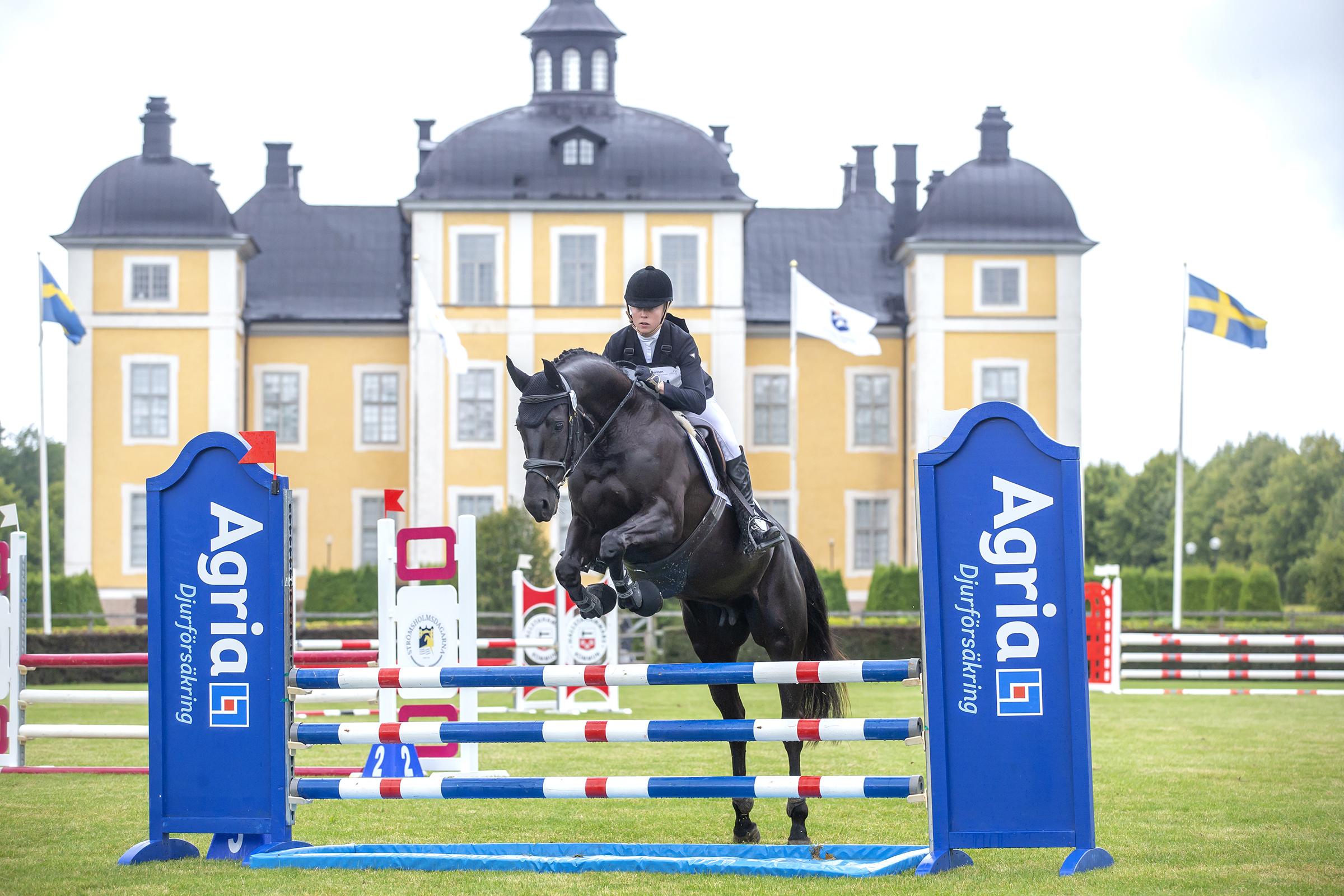 Flera av dem fick göra sin hoppning på Strömsholms anrika slottsbana i hällande regn. I topp efter de två inledande momenten ligger Kiara SB (SWB sto f 2015 e Benetton Dream FRH-Windfall, uppf Monica Lindstedt Metafor AB, äg Stjärnbro Stuteri/Metafor AB) riden av William Nilson Fryer.