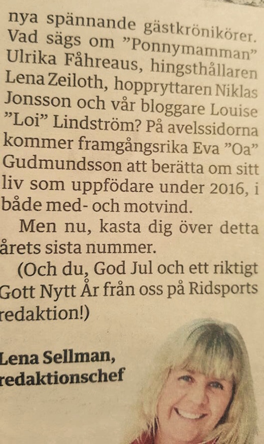 Jag ska också passa på att stolt och glad meddela att ni under 2016 kommer att få läsa mer av mig i Tidningen Ridsport. Jag har nämligen fått äran att bli gästkrönikör i själva tidningen! Min första krönika kommer i nr 3 och dessförinnan kommer t ex Ponnymammans första krönika, så har ni inte en prenumeration är det dags att skaffa den!