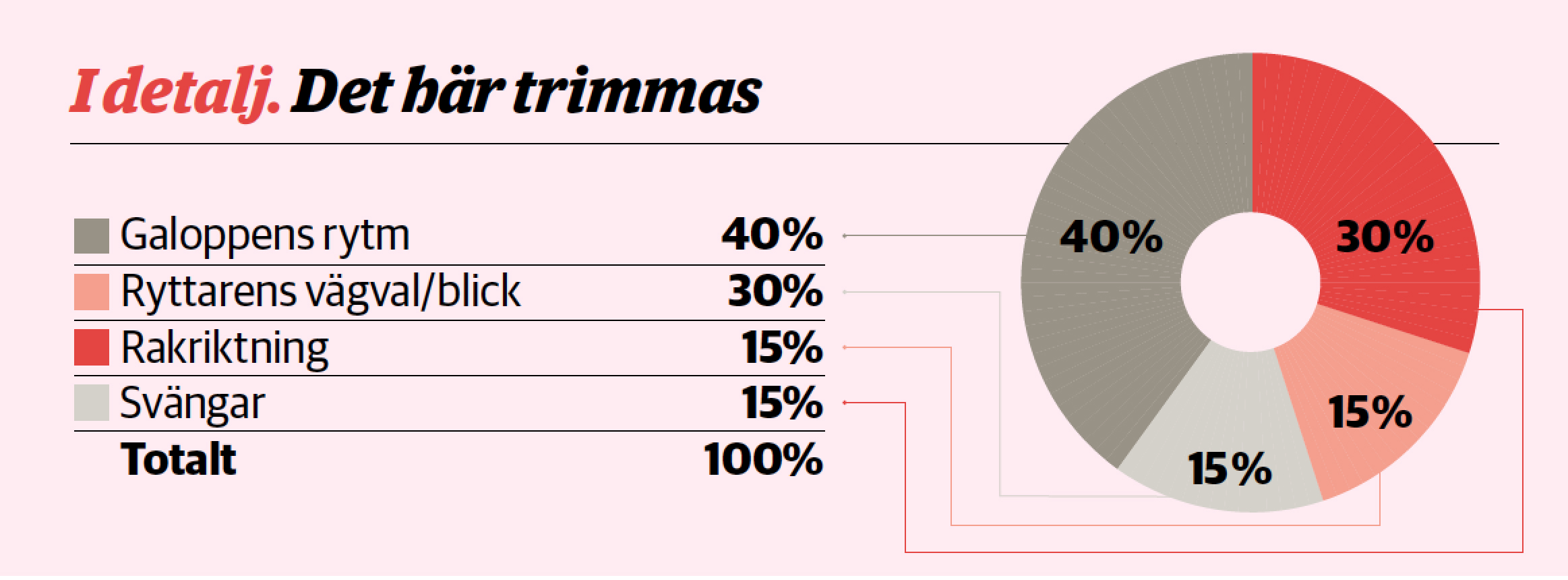 • Fokusera på bra vägar och jämn, bra galopp. Var noga med rakriktning respektive ställning, arbeta igenom moment för moment och förbered i god tid för nästa del.