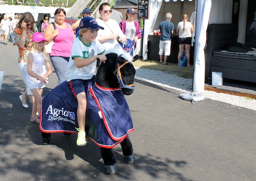 Det är full fart på Agrias maskot. Han rör sig hemtamt mellan montrar och utställningstält på området. Dessutom är han näst intill outtröttlig och bär runt på barn i stort sett hela dagarna utan att kräva vare sig mat eller vatten. Här tittar Julia Ewetz på när storebror Gustav Ewetz rider det som förmodligen är Falsterbos snällaste ridponny.