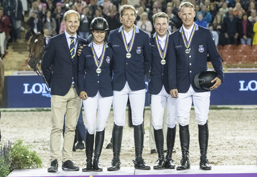 SILVER SVERIGE: Henrik von Eckermann med Mary Lou (Westf, sto, f -06, e Montendro-Portland L, uppf Hubert Nienhaus, äg Karl Schneider), Malin Baryard Johnsson med H&M Cue Channa (SWB, sto, f 2006, e Cardento-Robin Z, uppf Susanne Persson, äg Stuteri Arch), Douglas Lindelöw med Zacramento (SWB, val, f 2005, e Cardento-Cortus, uppf Björn Mattsson, äg B Håkansson Häst AB) och Peder Fredricson med H&M All In (SBS, val, f 2006, e Kashmir van Schuttershof-Andiamo Z, uppf Bas Huybregts, äg Stuteri Arch). Chef d’equipe: Henrik Ankarcrona.