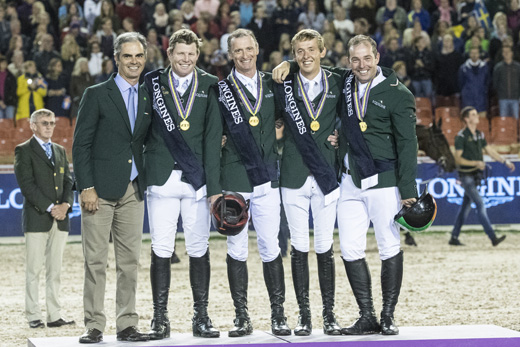 GULD IRLAND: Shane Sweetnam med Chaqui Z, Bertram Allen med Hector van d’Abdijhoeve, Denis Lynch med All Star 5 och Cian O’Connor med Good Luck. Chef d’equipe: Rodrigo Pessoa.