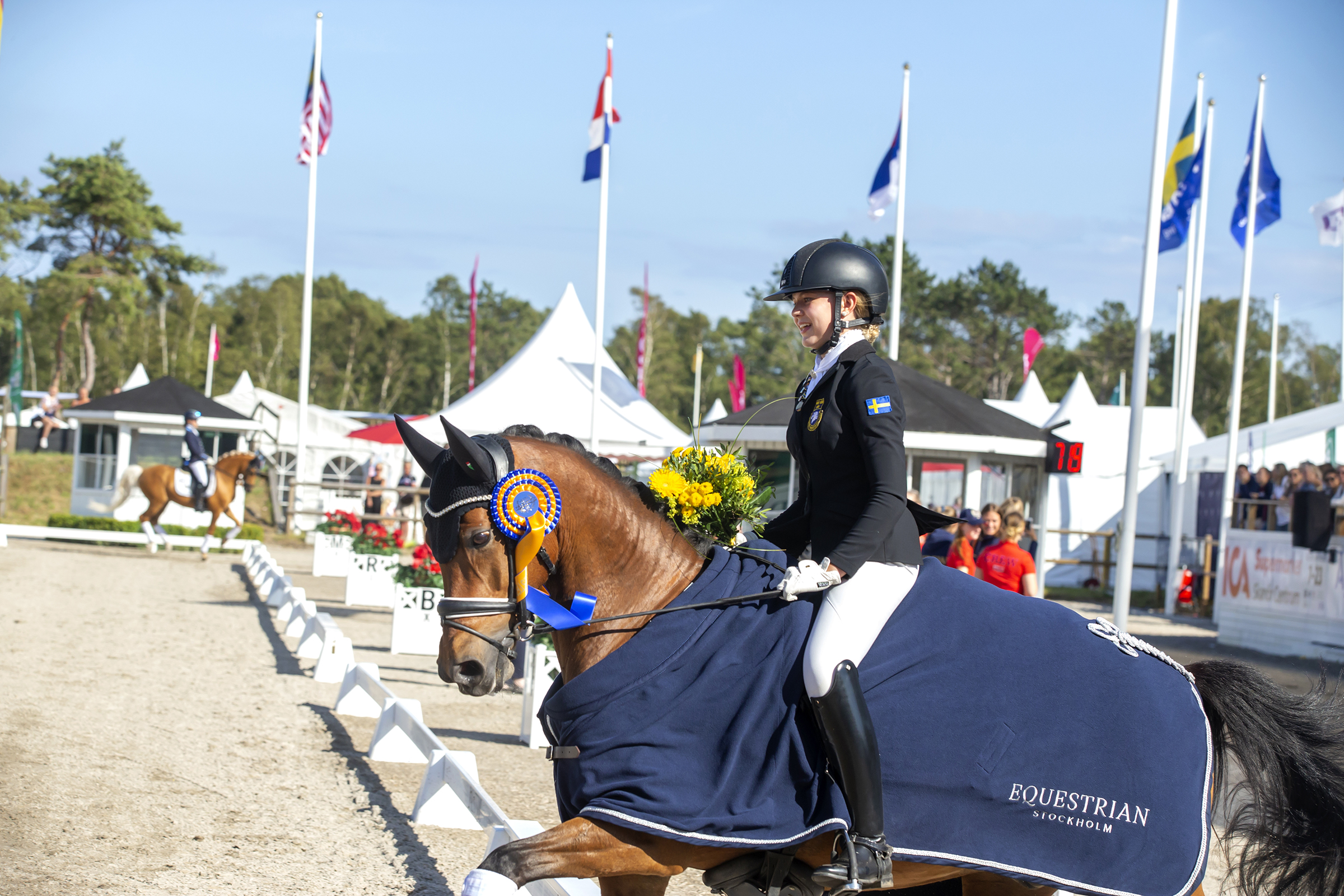 – Det är han som har tagit mig till den här nivån, säger Meja Karlsson efter att ha blivit omkramad av mamma och faster när det stod klart att hennes 71,937 i FEI-programmet skulle räcka till seger.