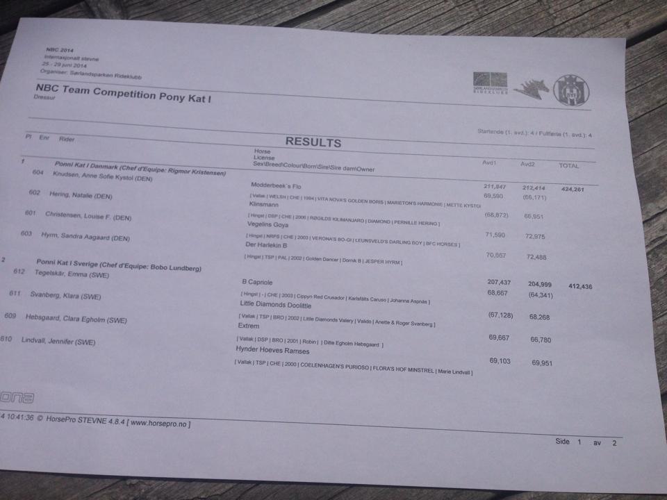 De svenska ponnyekipagen gjorde bra rundor men marginalerna i skiktet 68-70 procent var inte på deras sida. Jennifer Lindvall var tiondelar ifrån tredjeplatsen med 69,927 procent och Klara Svanberg med Little Diamonds inte långt efter på 68,268. De Danska ekipagen Louise Christensen/Vegelins Goya och Sandra Hyrm/Der Harlekin B hade båda över 72 procent och det avgjorde till Danmarks fördel.
