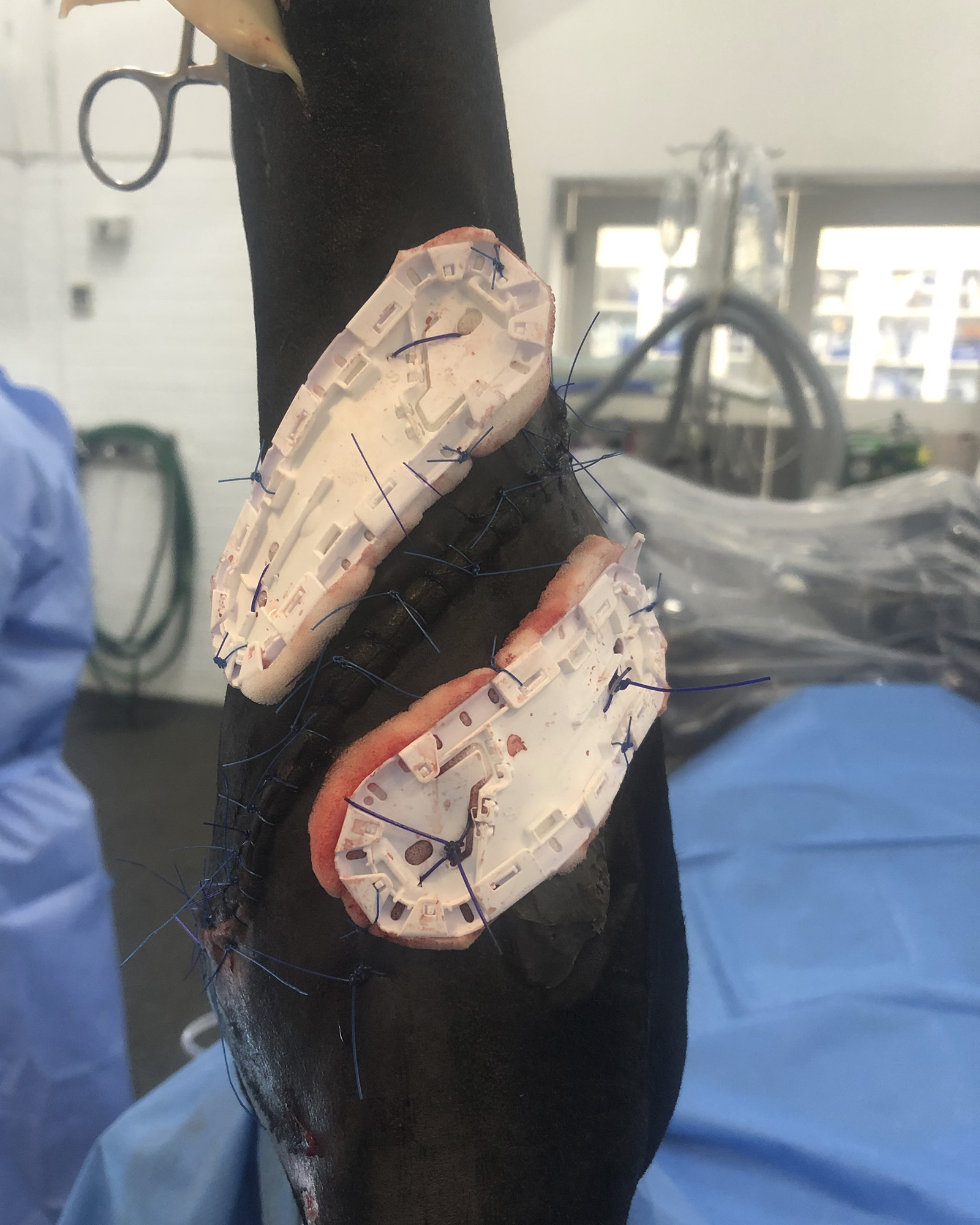 – Jag har undersökt allt från sårläkning hos delfiner till vad som används på humansidan, men lösningarna har antingen varit för klena för hästar eller för dyra. Sedan upptäckte jag att en plastikkirurg i Indien använt sig av de plastplattor som suturerna levererades i, berättar Dylan Gorvy.