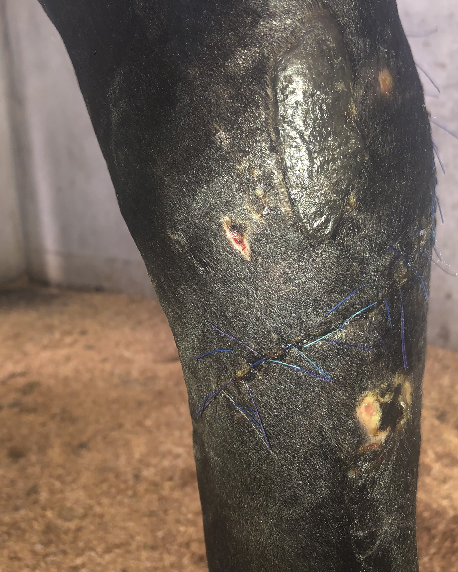 För att förhindra den dragning i såret som uppstår då hästen rör sig läggs ofta bandage eller skena som stöd.
