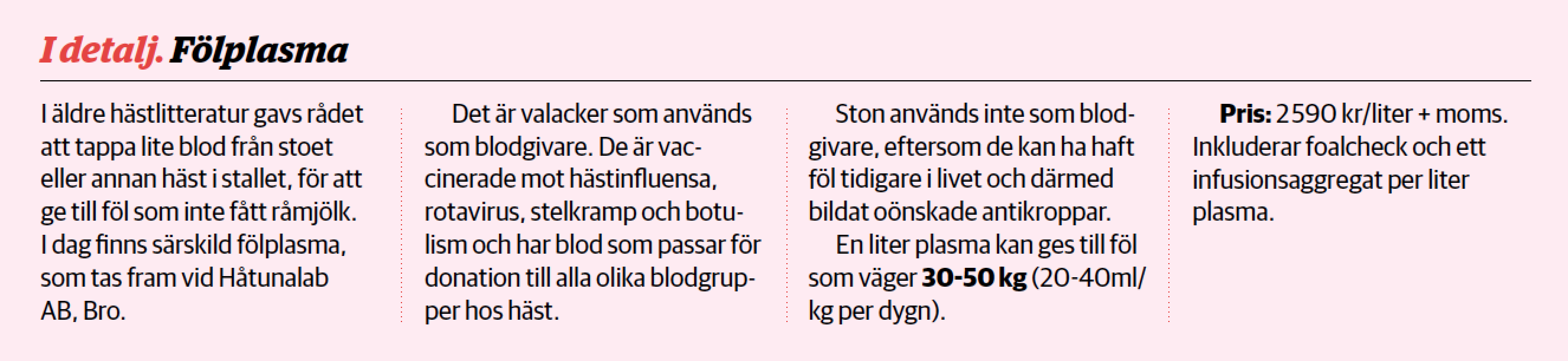 - Vid rotavirusdiarré. Plasman innehåller antikroppar mot viruset, eftersom donationshästarna blivit vaccinerade mot rotavirus.