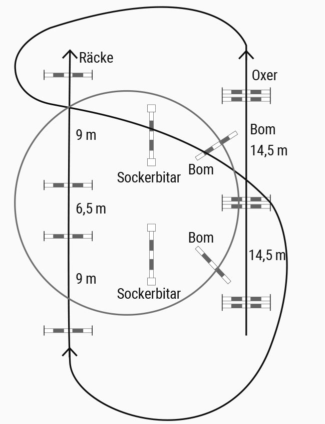 Lägg ihop till en bana. Börja med att rida fram på oxrarna med tre språng mellan hindren, vänd snett igenom och ta sockerbitshindret snett och därefter räckena.