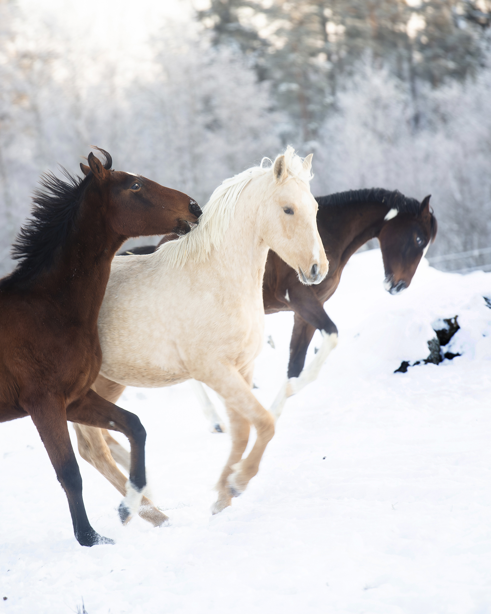 Unghästarna leker i snön. Sist i raden går Di Blueheart Zinosso, som blev ett av årets högst bedömda SWB-föl med hoppstam. Foto: Sandra Nordin-Johansson