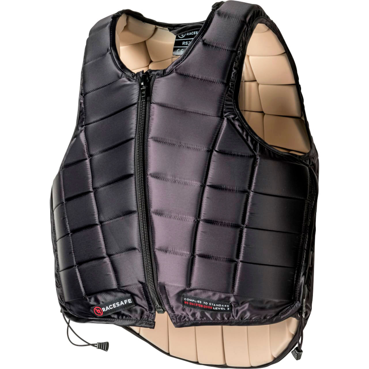 I Ridsportförbundets reglemente kallad skyddsväst, skyddar rygg och bröstkorg. Genom västens stötupptagande material fördelas trycket över kroppen så att skadan minimeras. En säkerhetsväst ska sitta nära kroppen med endast en tunn tröja under. Framstycket ska gå två-tre centimeter nedanför nedersta revbenen och bakstycket ska täcka upp till nedre delen av nacken och sluta några centimeter från svanskotan.