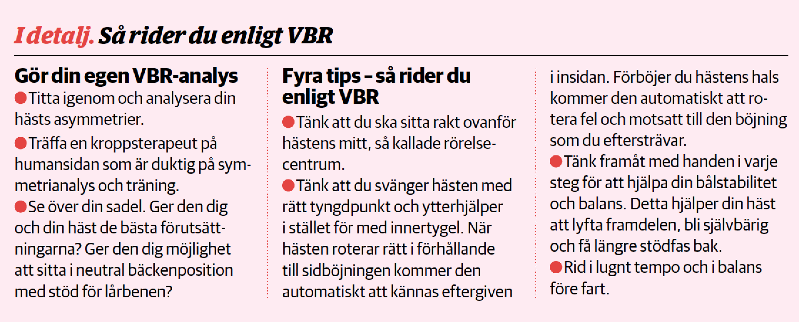 VBR bygger på modern forskning om hästens och ryttarens rörelsemekanik och handlar i grunden om tre saker: kraft, energi och rörelse. Med enkla verktyg får du förståelse för hur du ska sitta över hästen för att få så energisnål ridning som möjligt. Det vill säga, att ryttaren ska bli så enkel last som möjligt för hästen att bära på.