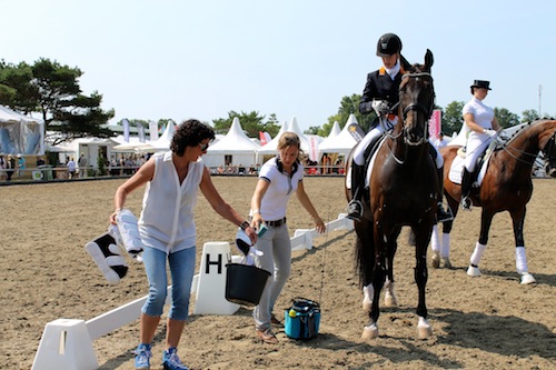 Holländska dressyrryttaren Katja Gevers och hennes team fixar det sista innan start i Grand Prix Special.